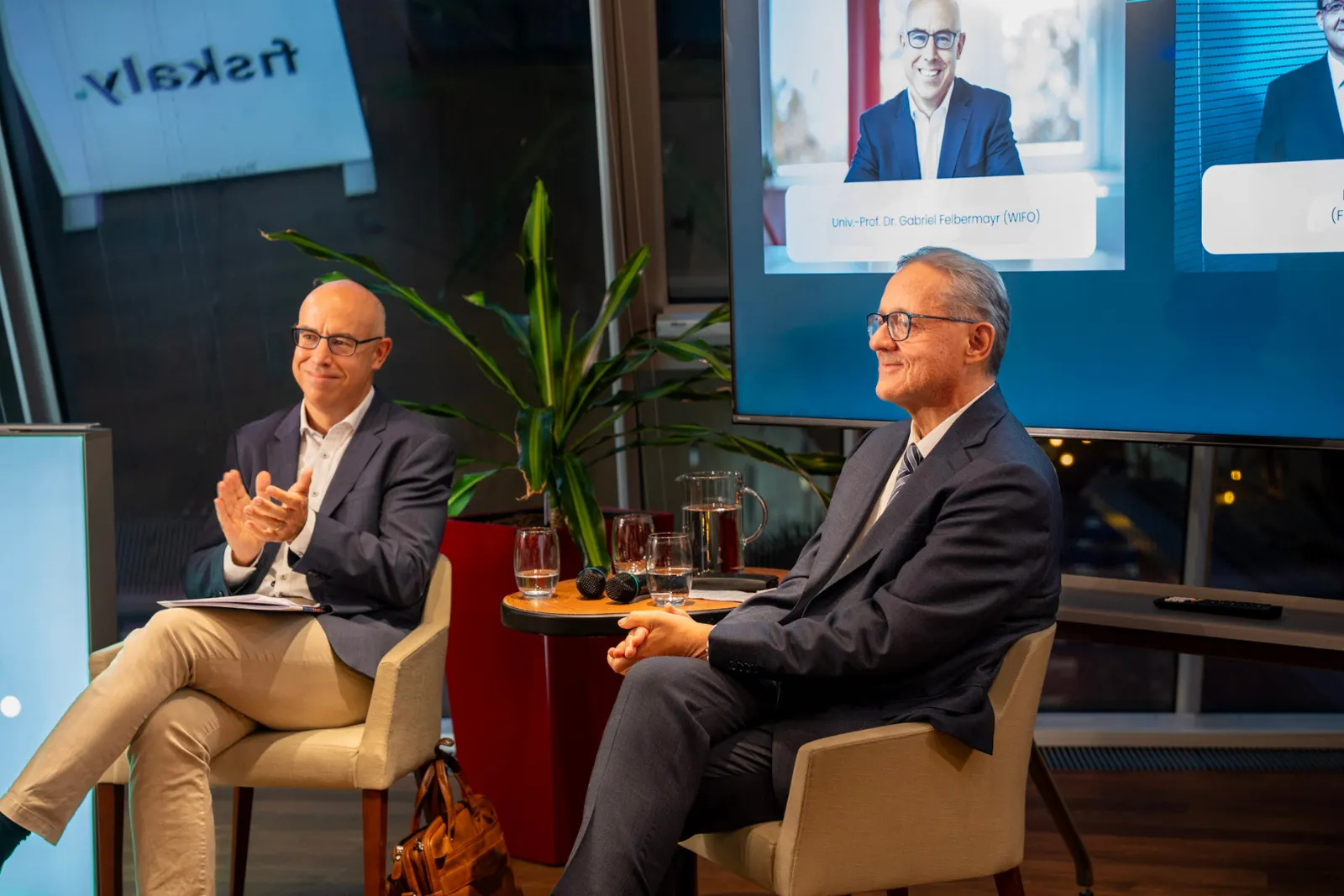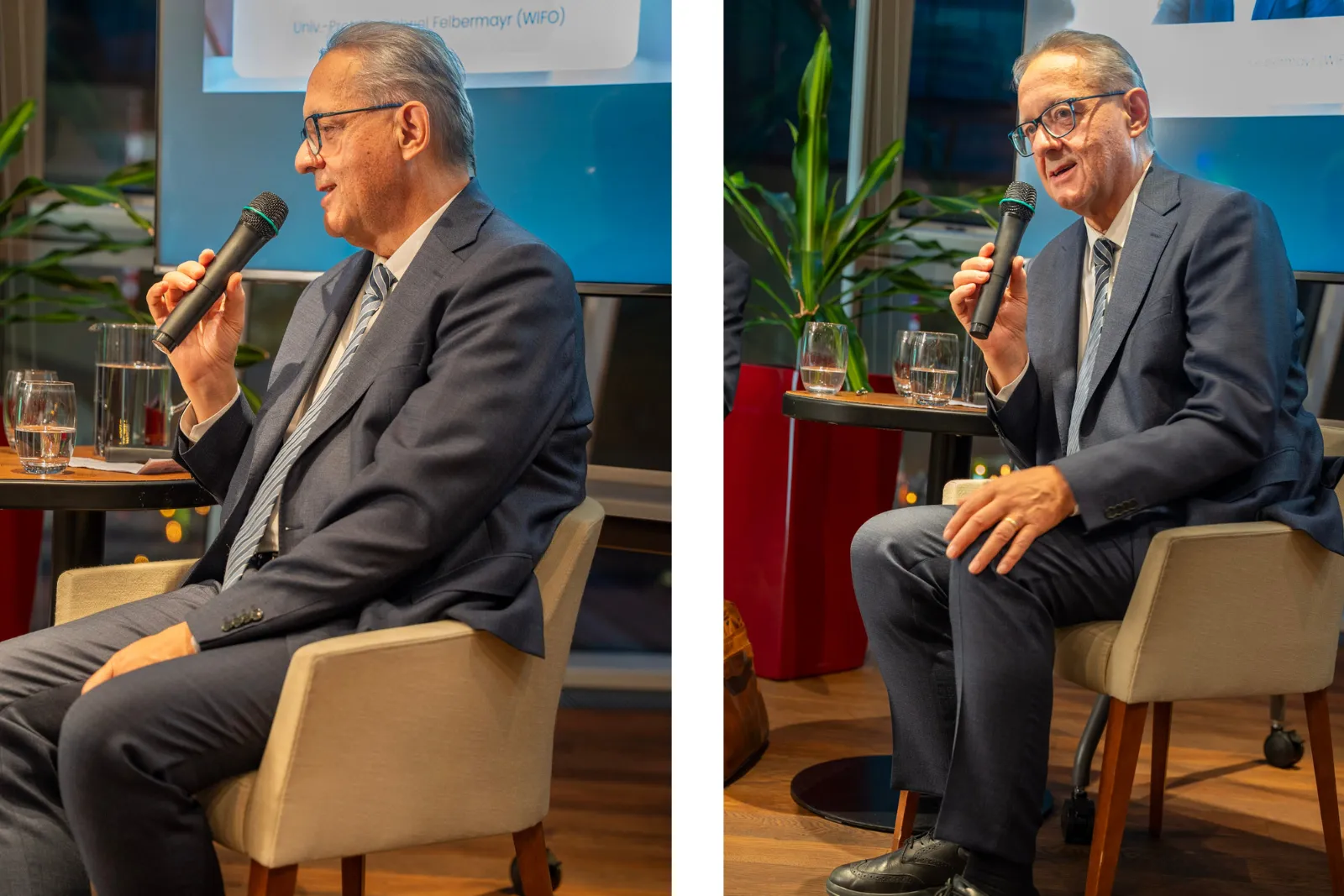 Zu Gast waren Univ.-Prof. Dr. Gabriel Felbermayr (Direktor des WIFO) und Dr. Günther Ofner (Vorstandsdirektor Flughafen Wien AG, Aufsichtsratsvorsitzender ÖBAG). In einem lebendigen Fishbowl-Format beleuchteten sie gemeinsam mit dem Publikum zentrale Fragen: